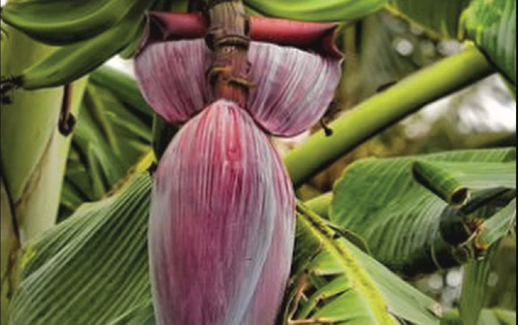 Banana flower is a large, dark purple-red colored blossom that grows from the end of a bunch of bananas. It is an edible flower that is used in Southeast Asian and Indian cooking, where they consider banana flower as a vegetable.