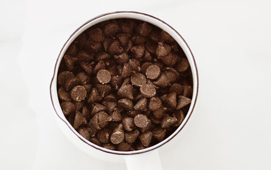 Chocolate chips are small chunks of sweetened chocolate. They have tear-drop like shape and are dark brown in color.