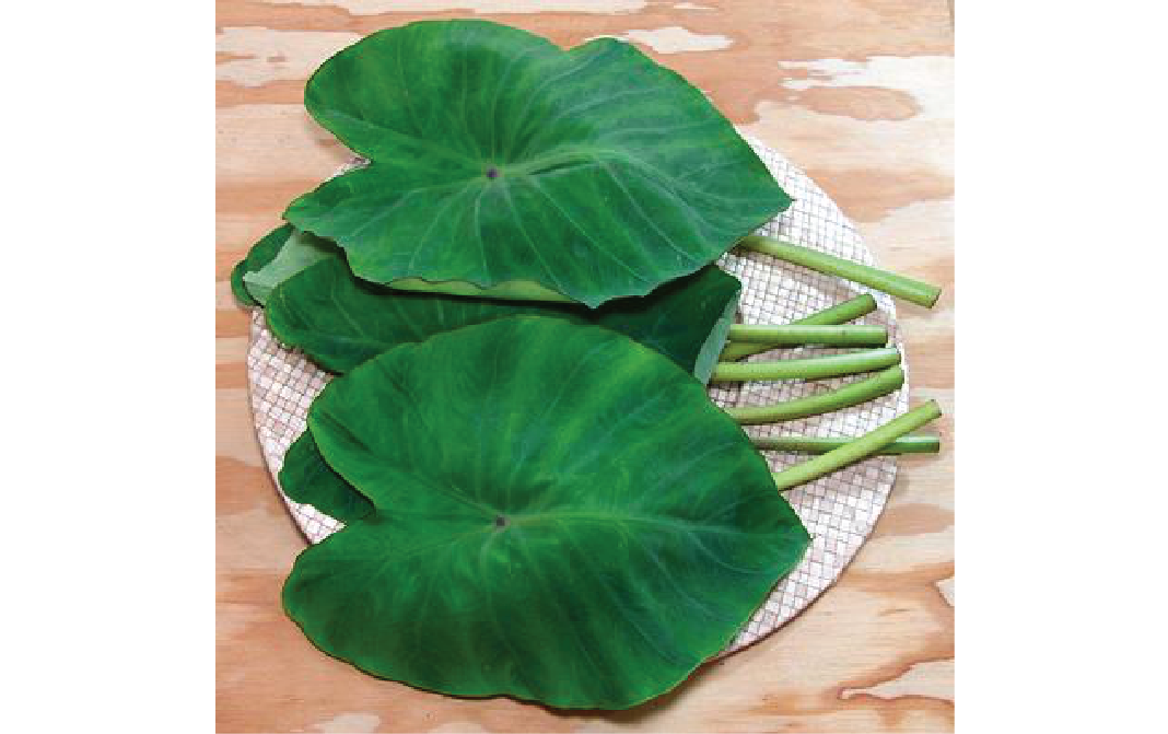 Colocasia leaves are edible leaves of tropical plant, Colocasia in the family Araceae, widely grown in Southeast Asia and Southern India. The leaves are smooth, heart shaped and deep-green in color with long stems.