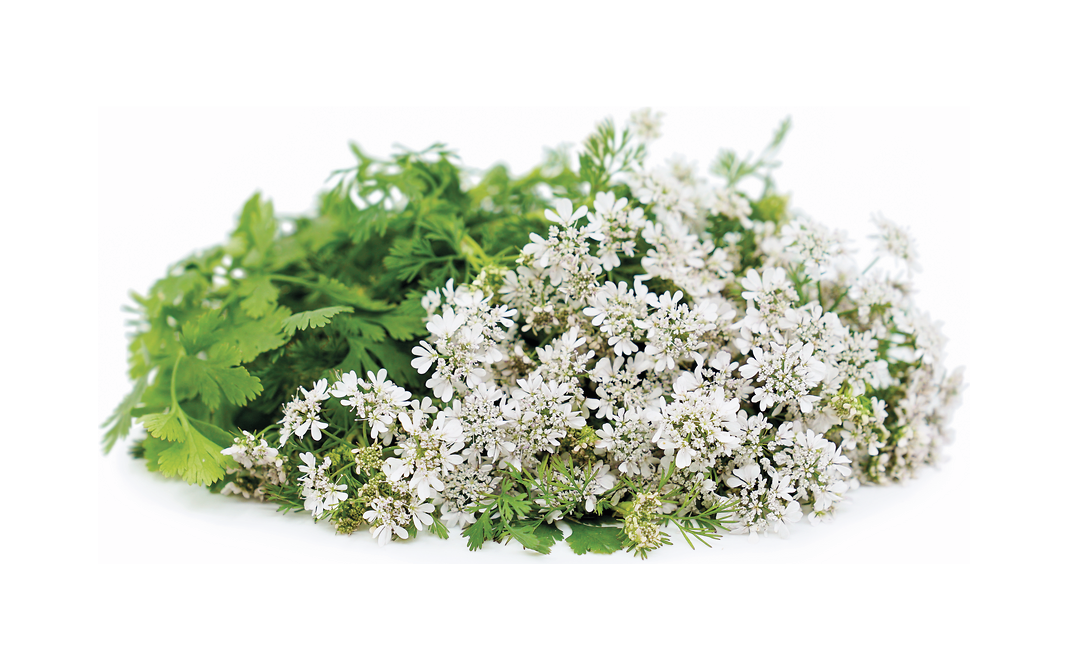 Coriander is an entirely edible, soft leafy, annual herb in the family Apiaceae. It is native to Southwest Asia and North Africa. It produces petite whitish-pink flowers in clusters called umbels. They have lacy decorative appearance with minimal aroma. They can be used along with coriander leaves at the end of cooking.