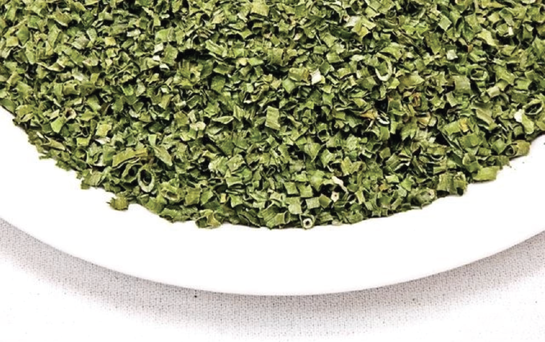 Chives are a perennial herb of the genus Allium, with long green stems. Dehydrated Chives are the dried chives that are spread on parchment paper or silpat and set outside in the direct sunlight until dry. They can also be dried in a microwave or food dehydrator. Once dried, they are crushed to bits and used for flavouring or seasoning dishes.