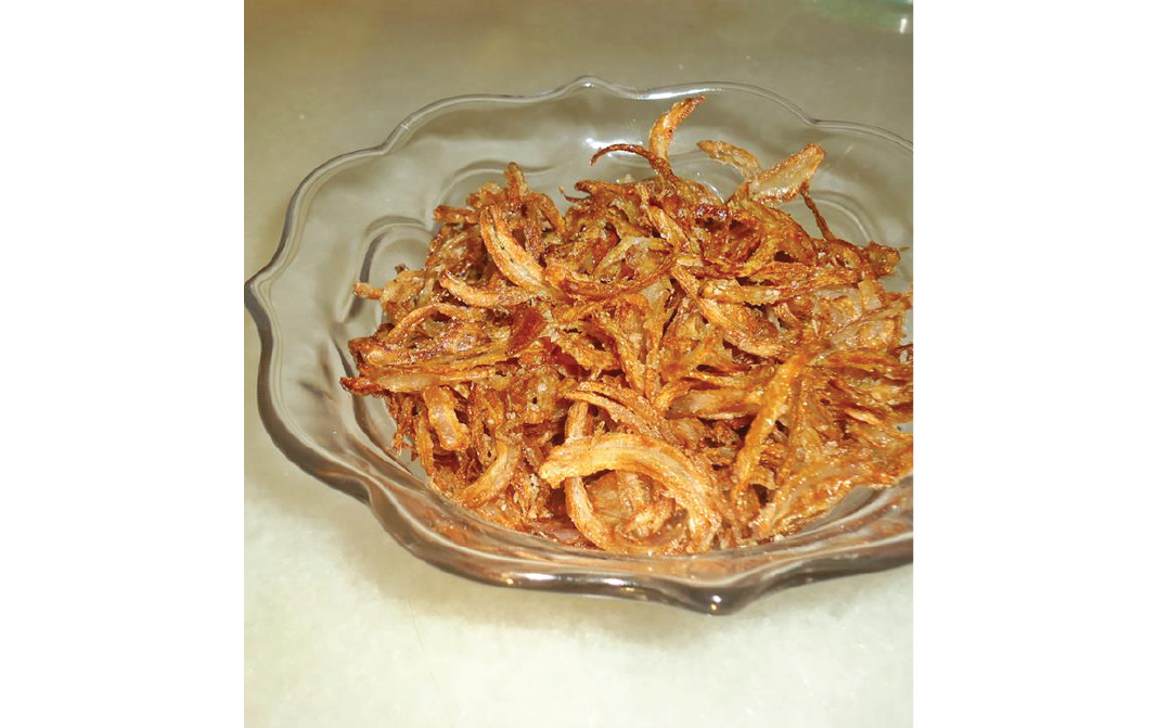 Fried Onions are large, ring-shaped, batter-coated onions cooked by basic pan-frying or sautéing on medium heat. They can also be shallow fried or deep fried in oil. They turn brown depending on the length of cooking and the temperature. They are used as a snack food, garnish or vegetable accompaniment to various recipes.It is available in market in powder form as well.