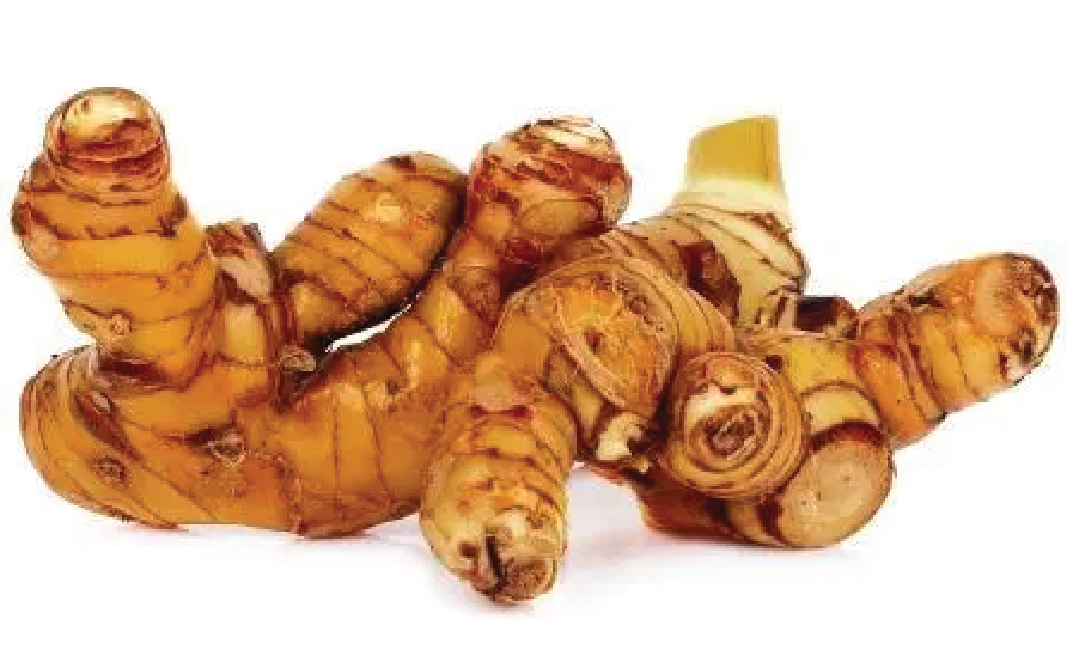 Galangal is a herb from the ginger family which is used as a spice in Asian cuisines. It is pale yellow or white in colour. It looks like ginger root and turmeric.