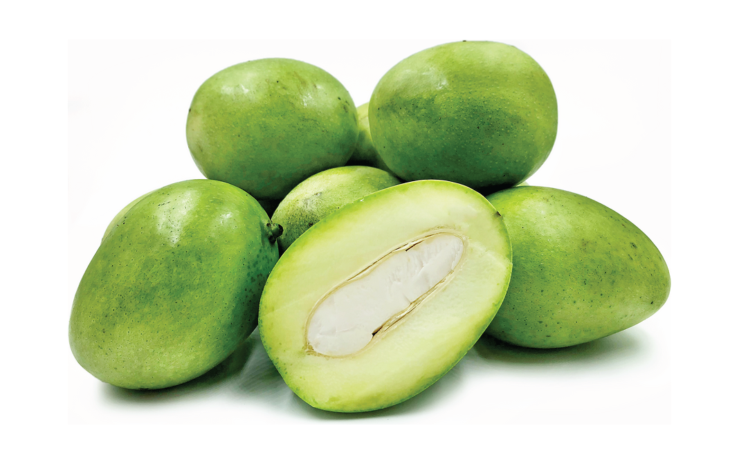 Green raw mangoes are the greener version of mangoes that range from oval to slightly kidney in shape. They grow at the ends of long stems on evergreen trees in subtropical and tropical regions. They are green in color with firm skin that offers tart smell. Their inside reveals firm and crispy flesh along with a small, thin stone in the centre. They can be crushed into a pulp/paste and used in cooking as well. They are commonly used in Thai cuisine. Green raw mangoes are available throughout the year.
