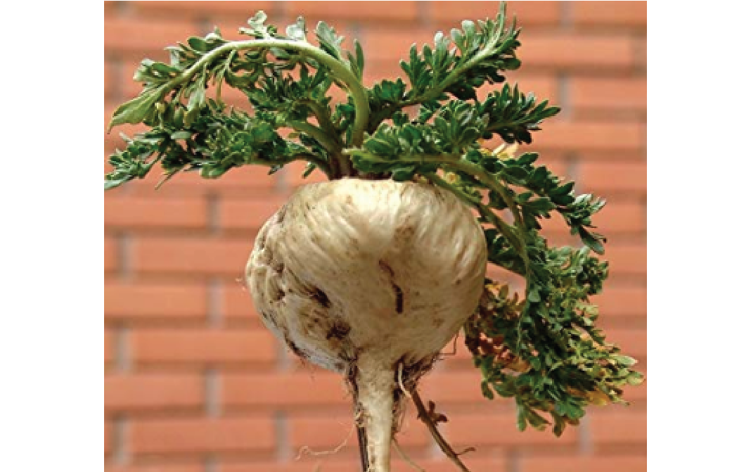 Maca is an edible herbaceous plant that belongs to the Brassicaceae plant family. It has green tops which are thin-frilly leaves and inverted pear-shaped body.