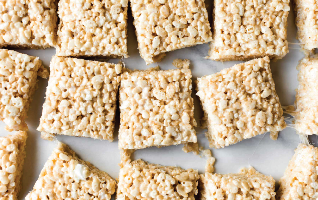 Rice Crispies are usually a square or rectangle-shaped confectionary made from crisped rice. Crisped rice is a rice and sugar paste that is formed into rice shapes, cooked, dried and toasted. It is then expanded forming very thin and hollowed out walls that are crunchy and crisp. When milk is added and cereal is subjected to a change in heat, its walls tend to collapse, creating the "crackle and pop" sounds. It is even available in powder form.