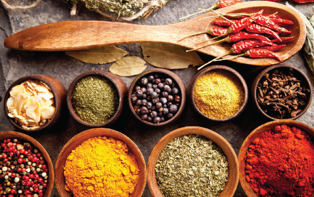 Spices & Condiments are used to enhance the color and flavor of the food. Spice is a dried seed, fruit, root, bark, or vegetable substance which is essentialy used for flavoring, coloring or preserving food. They are mainly added during the cooking process. Examples of spices include ginger, turmeric, cumin, red chili and Cinnamon. Condiments are usually added after the dish is prepared except some like barbecue sauce, teriyaki sauce, soy sauce and marmite that are used during cooking to add flavor or texture to the food. Sauces. ketchup, mustard, relish, and tabasco are all condiments.