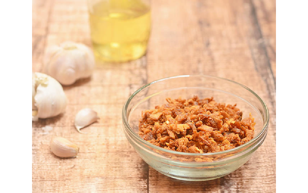 Toasted Garlic is minced or crushed garlic cloves, fried in cooking oil in a pan with low or medium heat for 5-7 minutes until it turns golden brown and soft. The oil should be enough to allow the garlic pieces to swim freely in the pan. The excess oil is drained and toasted garlic can be transferred to a bowl and used as a condiment.