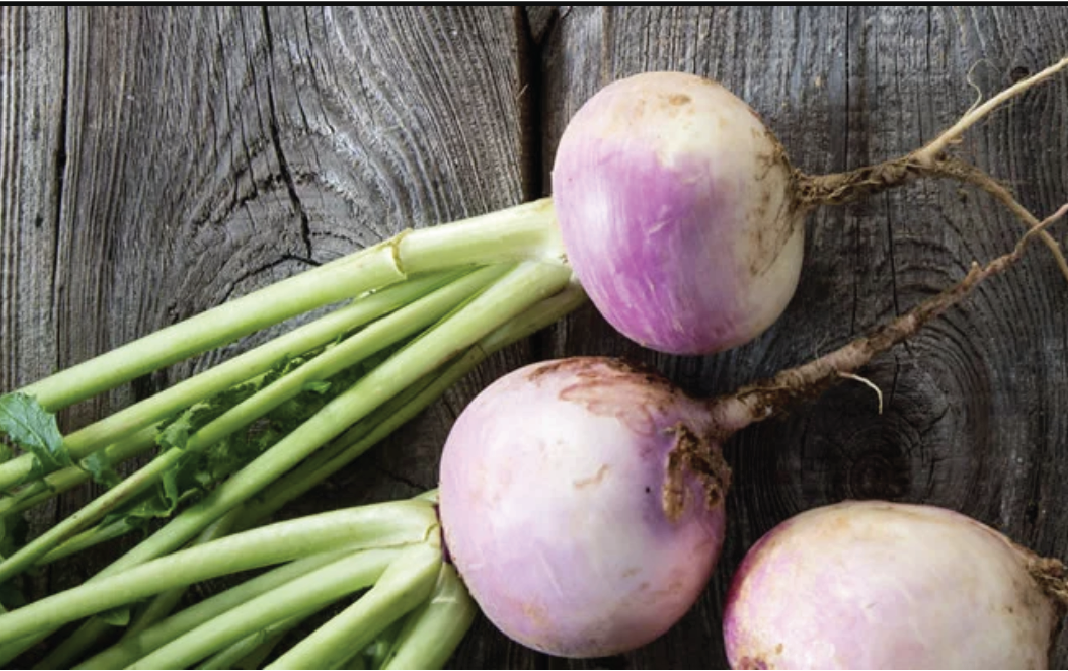 Turnip is a root vegetable having roughly conical shape. It is white at the bottom with light purple blush on the top. The interior flesh is entirely white.