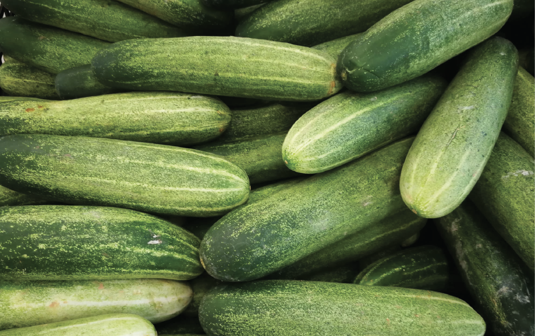 Cucumber is a summer vegetable, with elongate shape and 15cm long. Its skin is of a green colour, turning into yellow in maturation. Cucumbers originated in India almost 10,000 years ago, but are now cultivated in many countries. There are three main varieties of cucumber: slicing, pickling, and seedless. Cucumbers grown to eat fresh are called slicing cucumbers. The main varieties of slicers mature on vines with large leaves that provide shading. Pickling with brine, sugar, vinegar, and spices creates various, flavored products from cucumbers and other foods. Although any cucumber can be pickled, commercial pickles are made from cucumbers specially bred for uniformity of length-to-diameter ratio and lack of voids in the flesh. Seedless/ Burpless cucumbers are sweeter and have a thinner skin than other varieties of cucumber. They are reputed to be easy to digest and to have a pleasant taste.