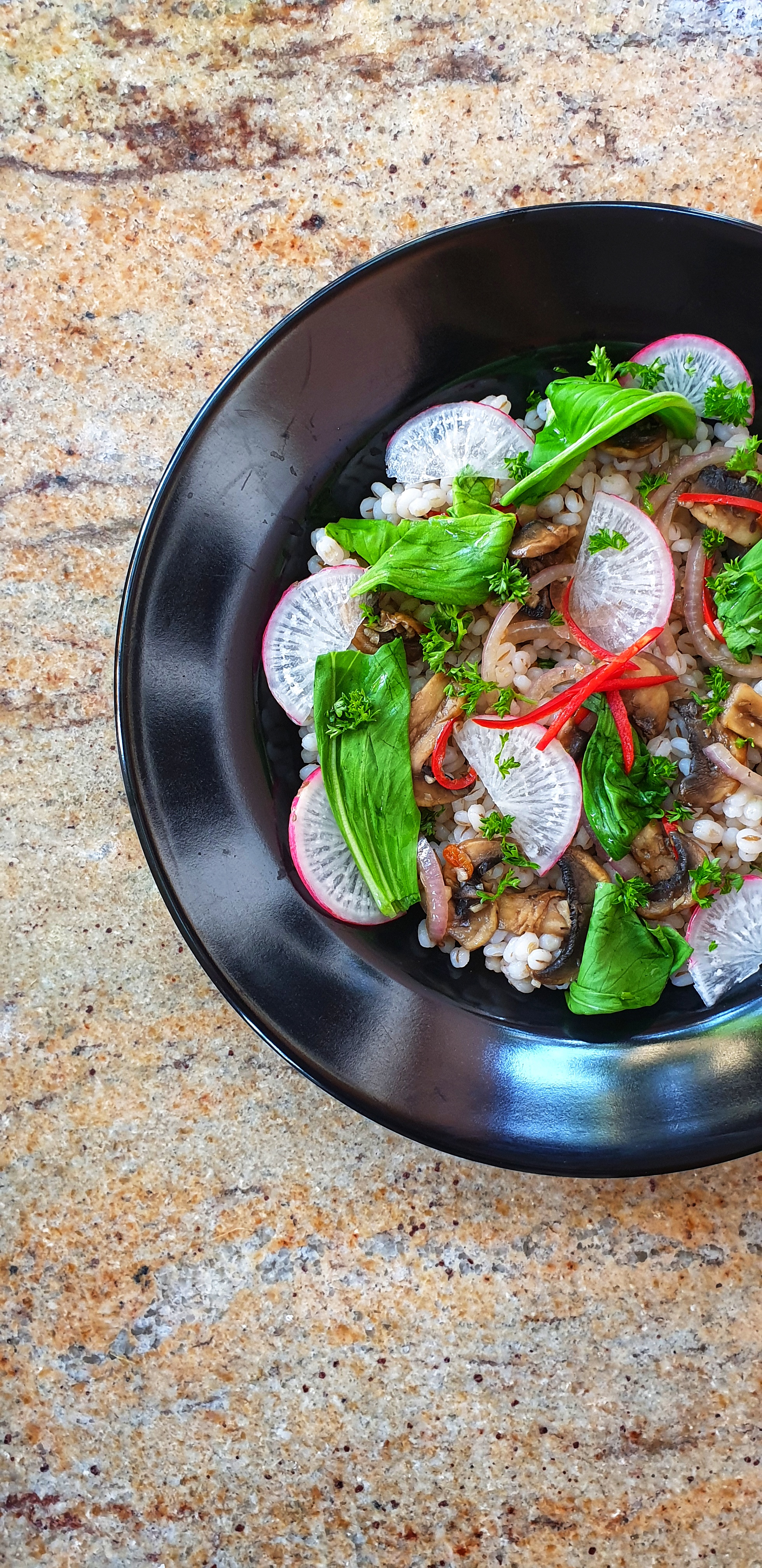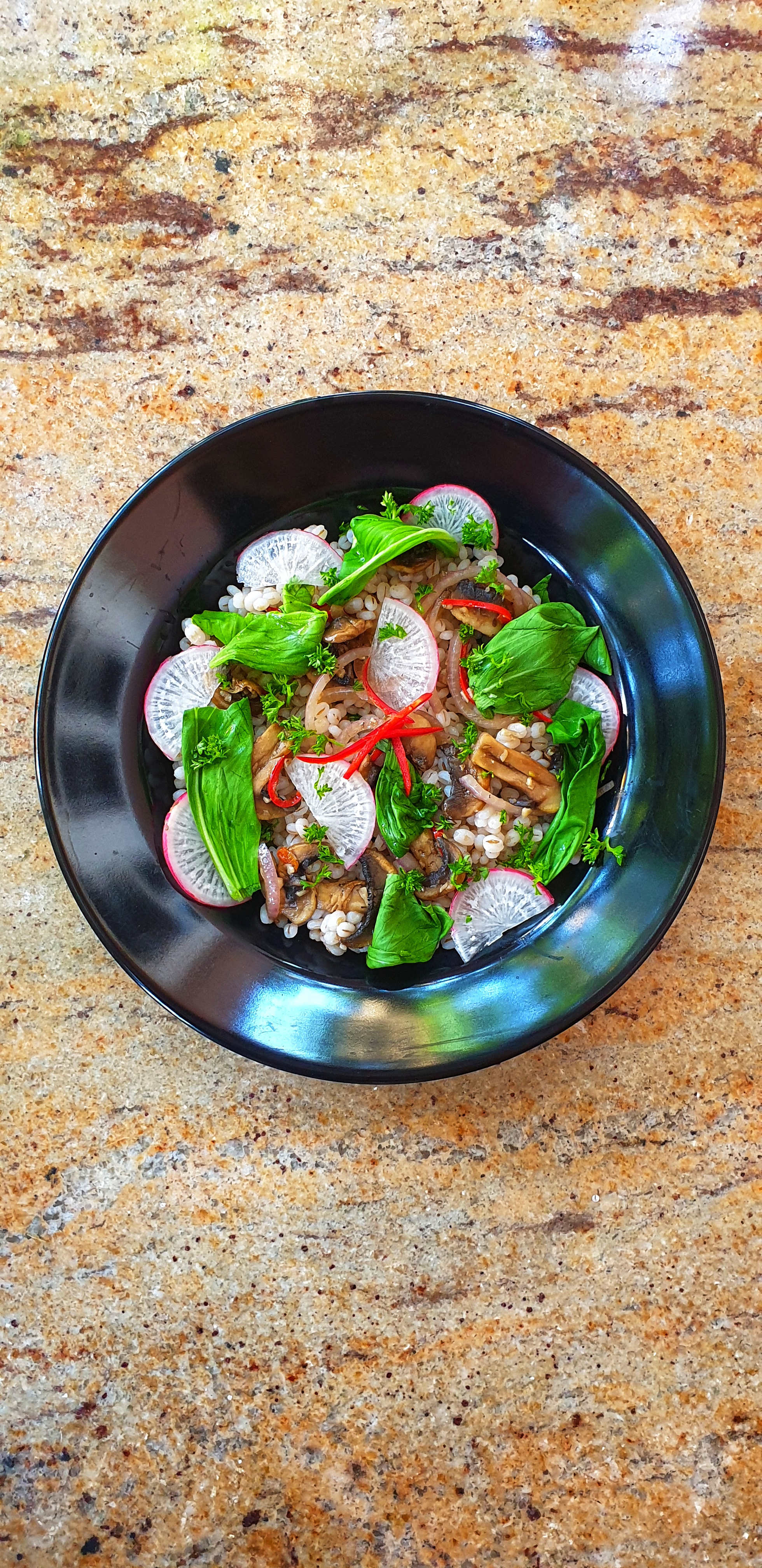 Salads can be more than just raw veggies and bland flavours. You can blend various flavours, ingredients and combinations there's literally no boundaries to the variations. Let's celebrate veggies and bring out the most out of them!! This is an Asian inspired pearl barley salad with mushrooms, bokchoy, radish, chilli, onions and parsley. It is drizzled with an Asian dressing of soy sauce and vinegar!! It tastes so fresh and delicious.