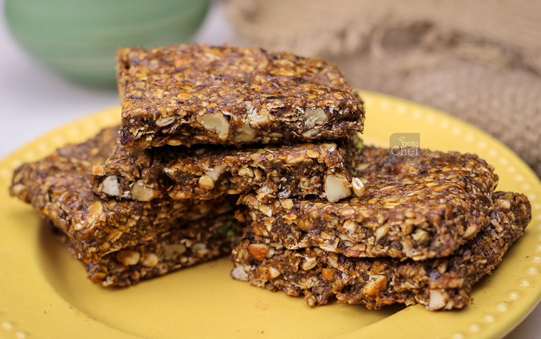 This granola bar is very rich in iron due to the generous portion of dates in it and also rich in protein with the various nuts and seeds added to it. It is also high in energy !