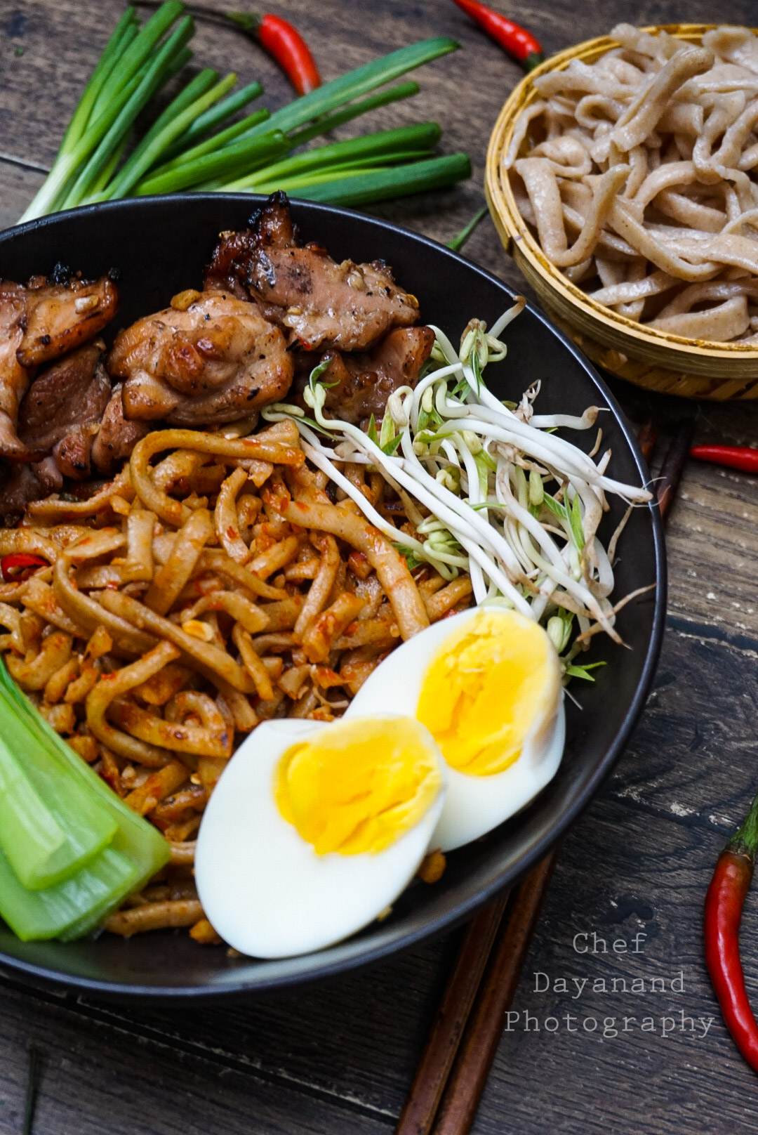 There is a Chinese saying that, "There is no satisfaction without noodles," I tried my hands on hand cut noodles last week and it was a good experience,now that the noodles are ready let's try a simple recipe by using these handcut noodles.I have used gouchjong paste in preparing this dish I will call it "Spicy gouchjong handcut noodles with grilled chicken".